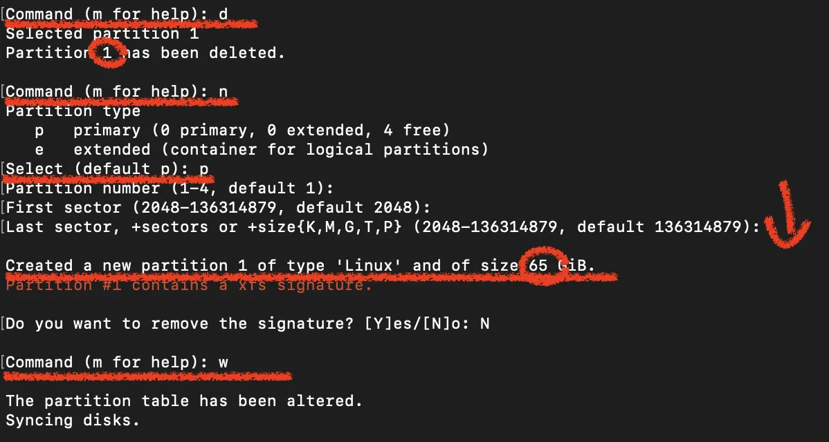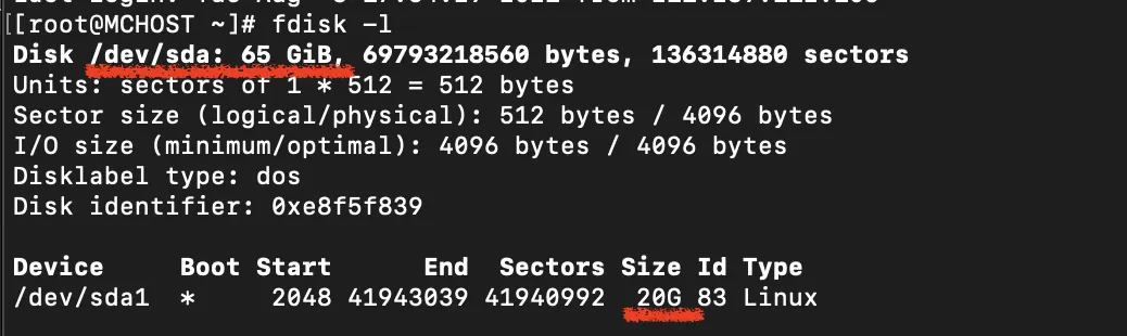 그리고 엔터 3번을 진행하면 변경 후 디스크 용량으로 파티션이 생성된 것을 확인할 수 있습니다.