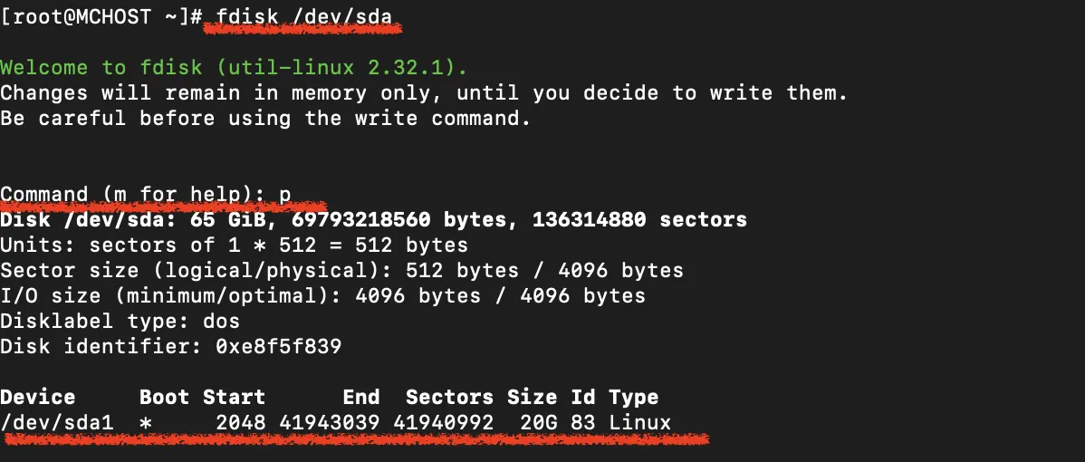 fdisk 에 접속하면 p 를 입력해서 확장해야하는 파티션을 확인합니다.