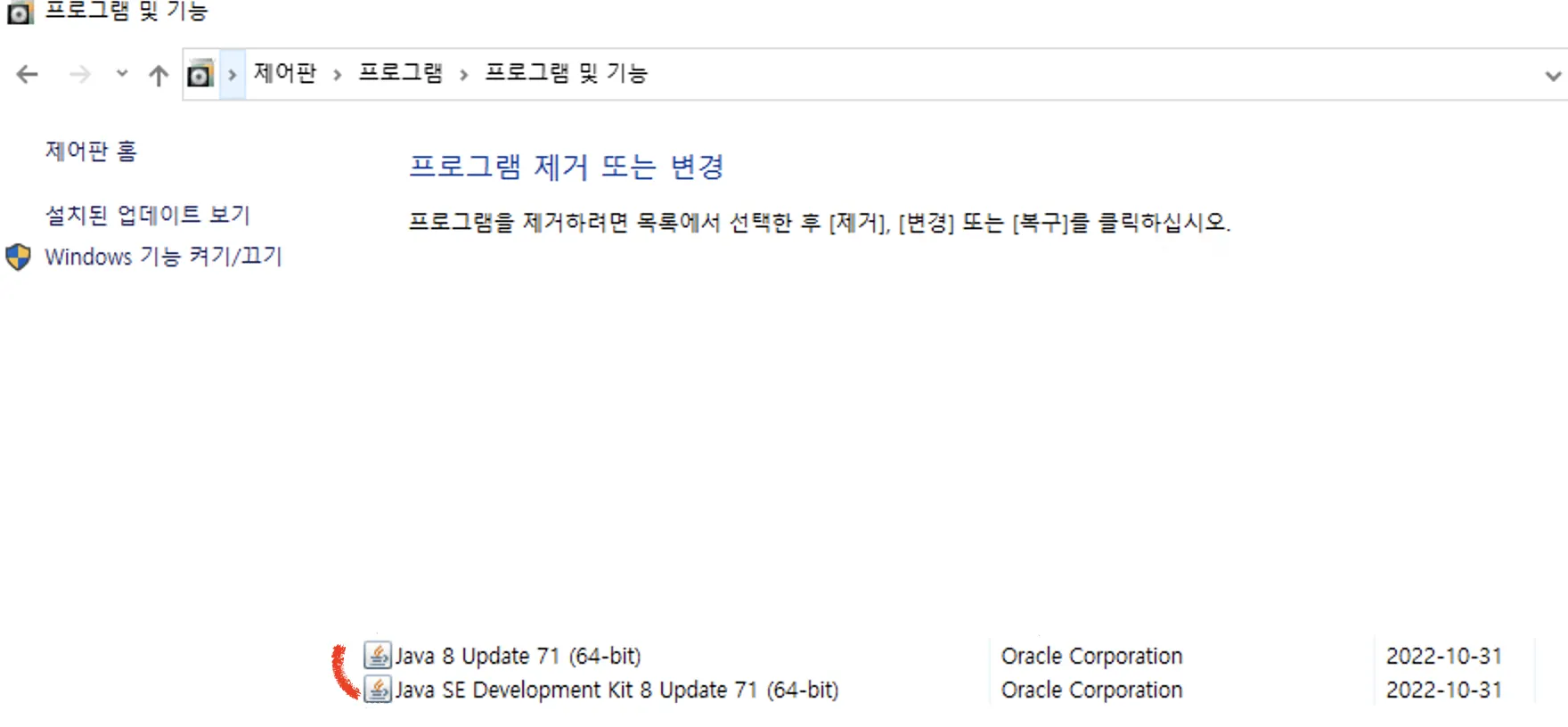 제어판 → 프로그램 → 프로그램 및 기능 에 접속해서 설치되어 있는 Java 를 모두 삭제해주세요.
