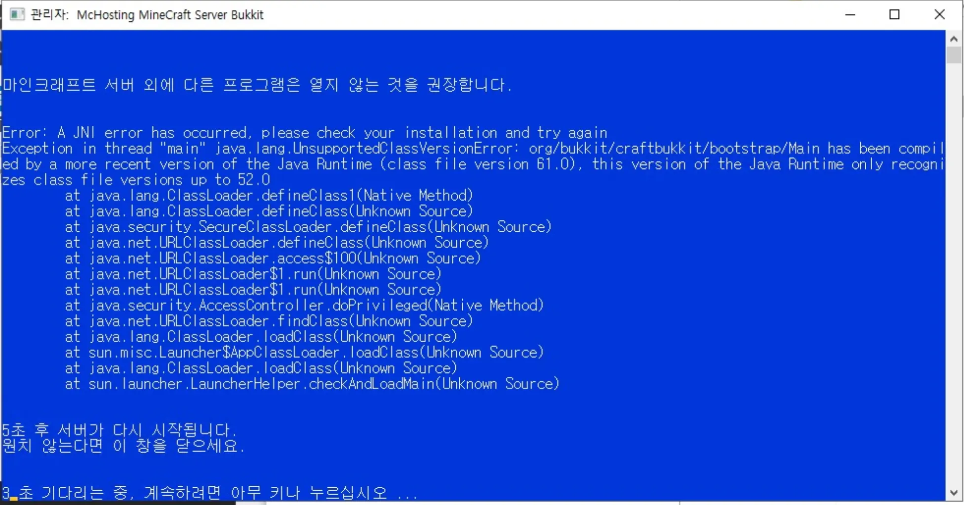 호스팅 컴퓨터에 설치되어 있는 JAVA(자바) 버전이 안 맞아서 나오는 오류에요.