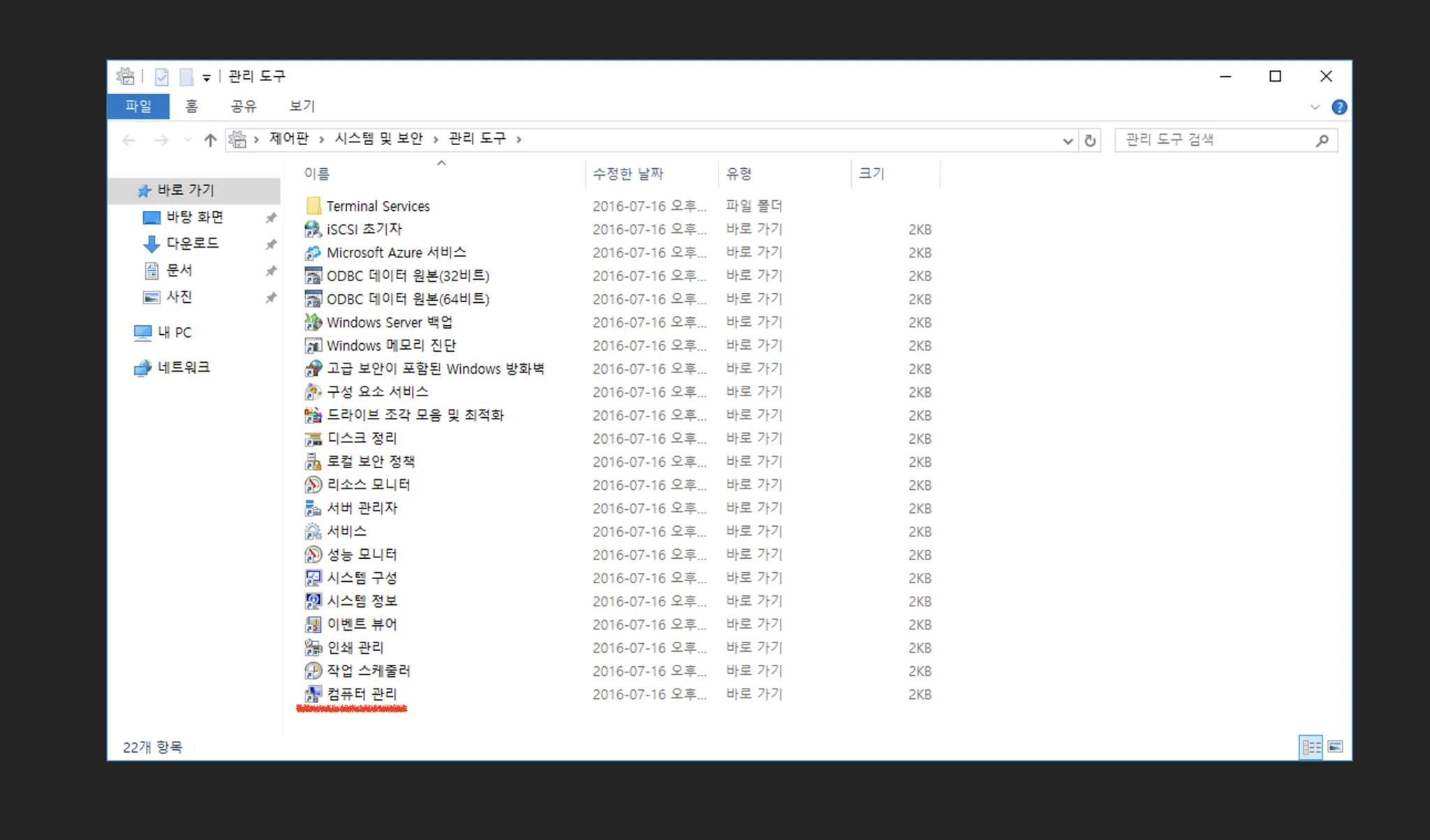 관리도구 화면이 나오면 "컴퓨터 관리"를 클릭 합니다.