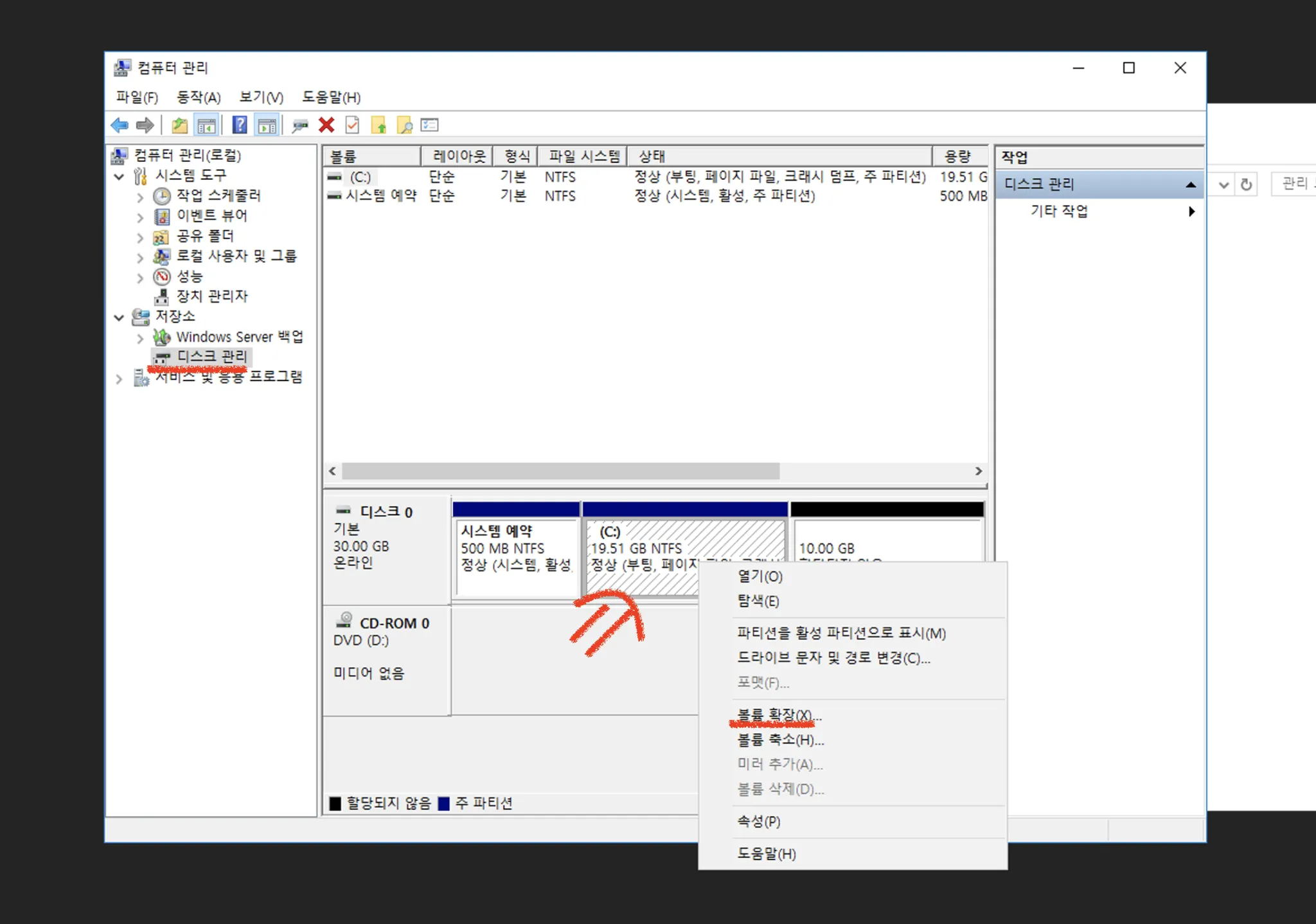 C 드라이브 부분을 (화살표) 마우스 우클리기 하면 볼륨 확장이 나옵니다.