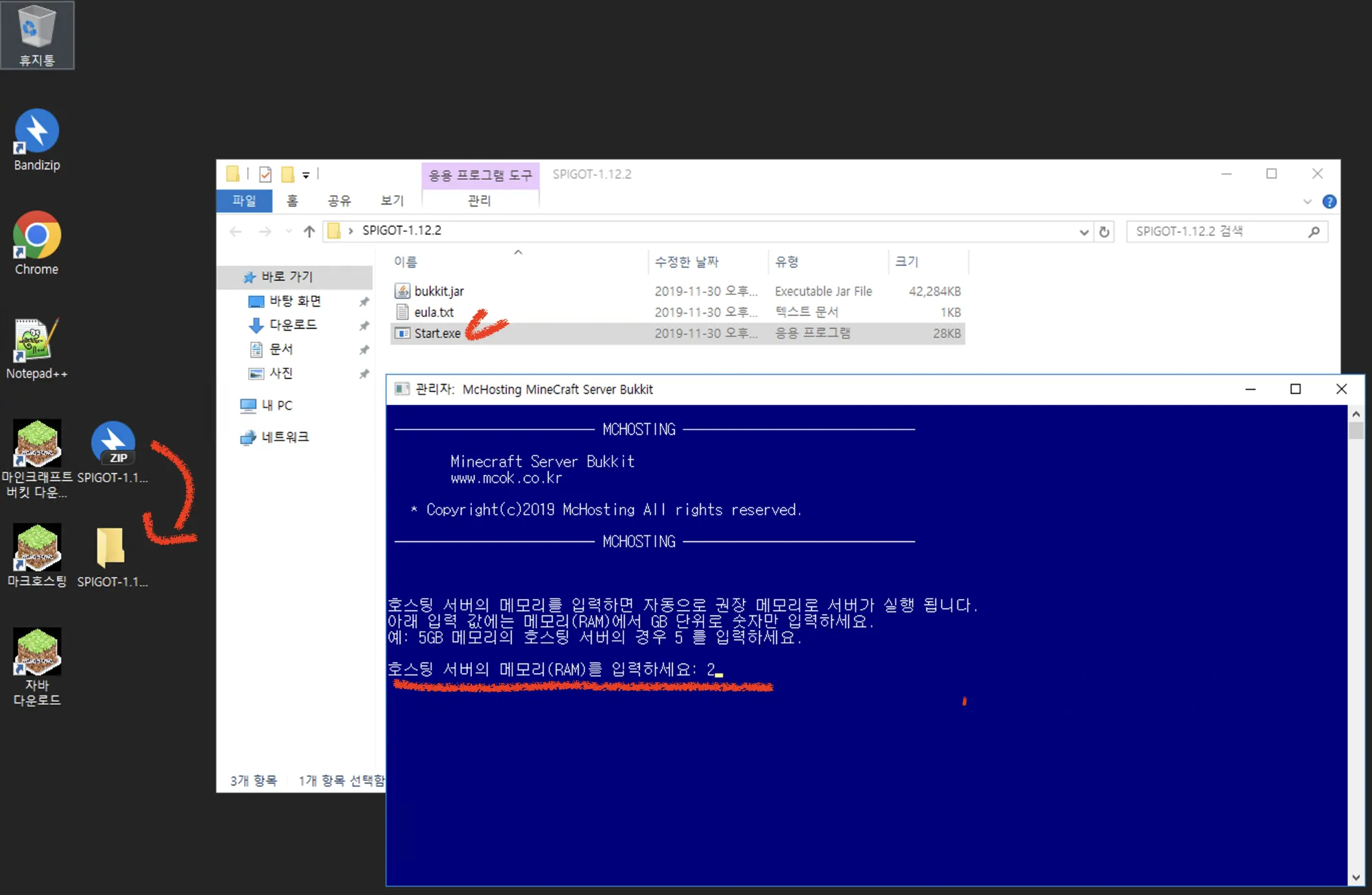 Start.exe 를 실행하면 “호스팅 서버의 메모리(RAM)를 입력해주세요: “ 라는 내용을 확인하실 수 있습니다.