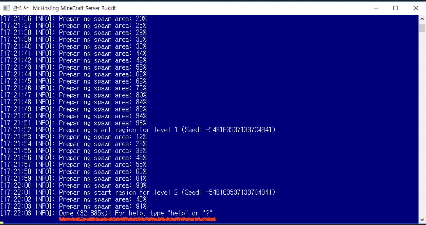 Done (32.385s)! For help, type "help" or "?” “ 내용이 위 사진처럼 확인되신다면 서버가 정상적으로 실행되었습니다.