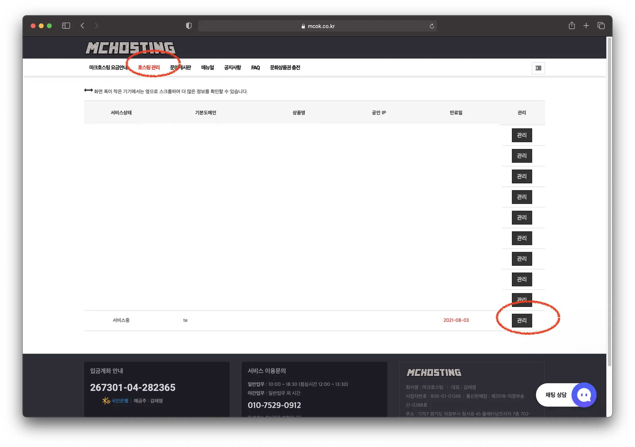 호스팅 관리 → 연장하는 서버 "관리" 버튼을 클릭 합니다.