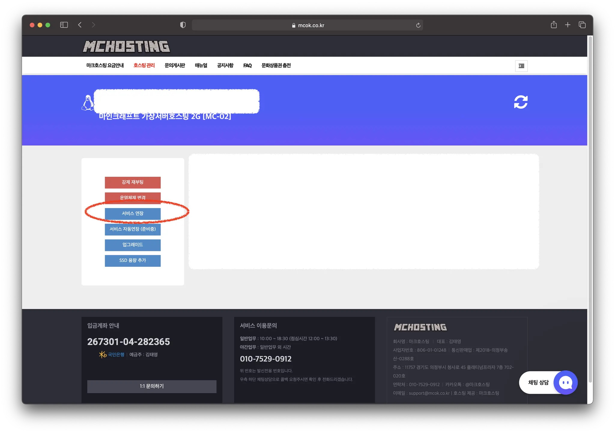 호스팅 상세 관리 페이지에 접속되면 "서비스 연장" 버튼을 클릭 합니다.